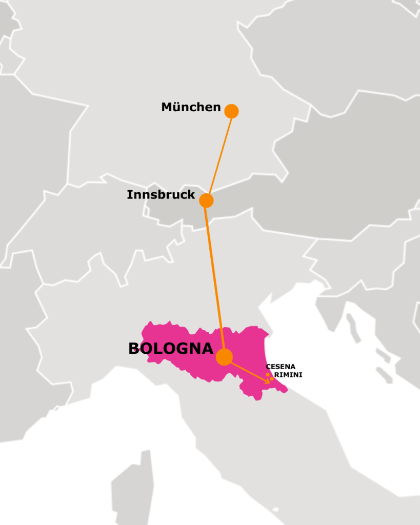 Er heißt DB-ÖBB EuroCity RJ 83 und hält auch in Cesena und Rimini (die günstigsten Bahnhöfe, um uns zu erreichen).